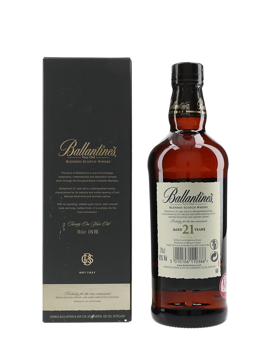 A bottle of Ballantine's 21 Year Old Very Old Scotch Whisky, produced and bottled by George Ballantine & Son Ltd.