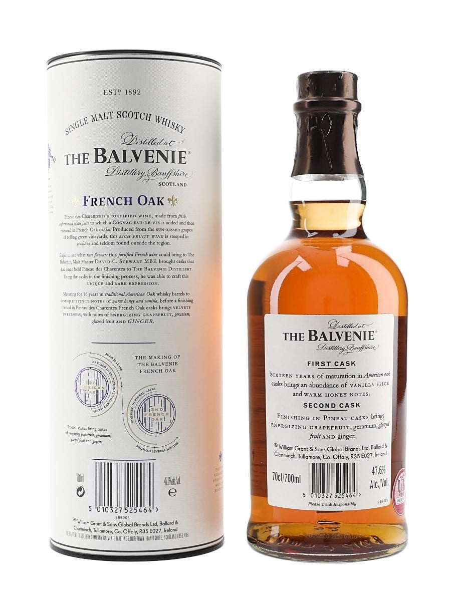 A bottle of The Balvenie 16 Year Old French Oak Single Malt Scotch Whisky. This was matured for 16 years in American oak casks and finished in casks which previously held Pineau des Charentes.