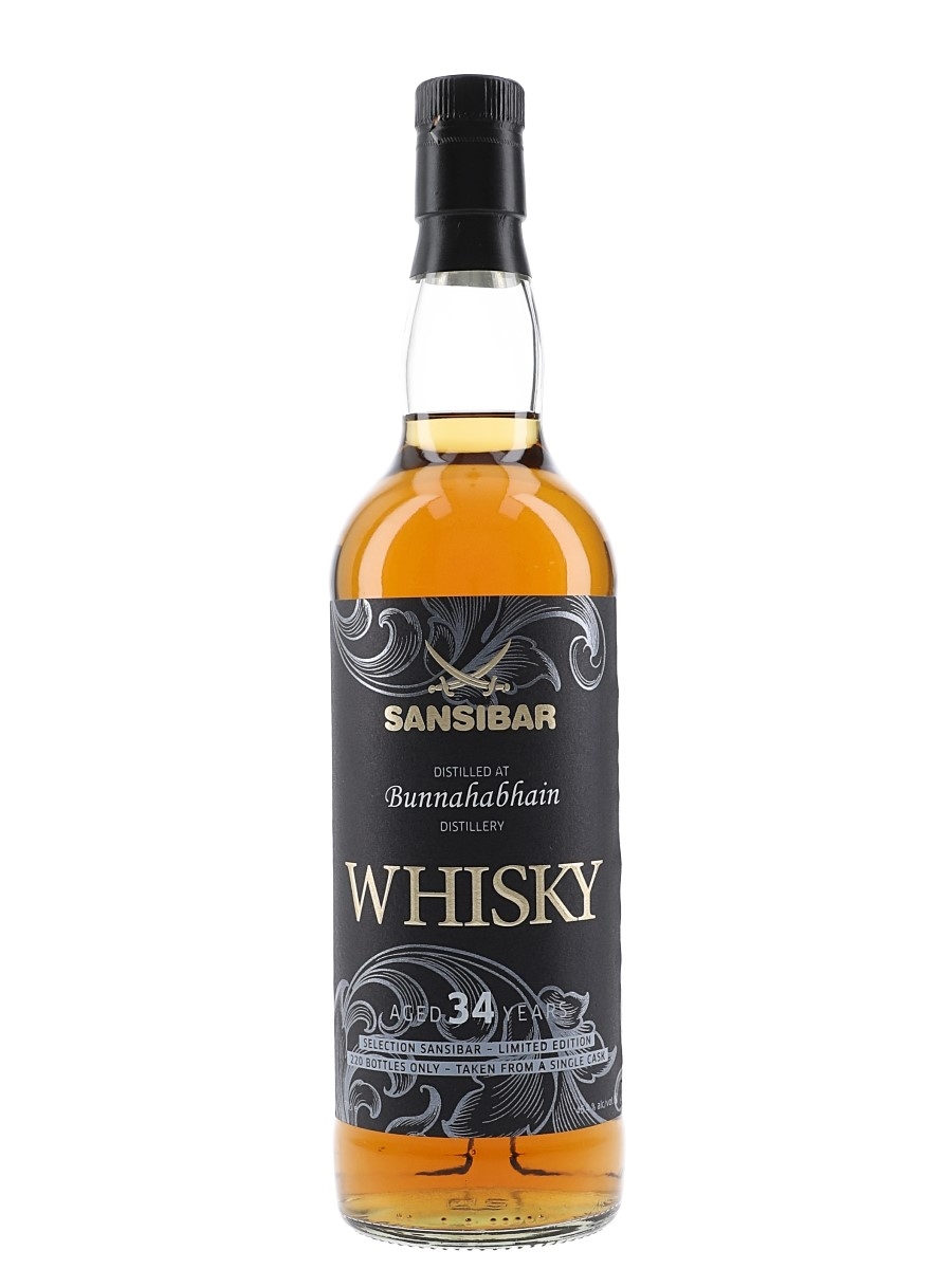 A bottle of Bunnahabhain 34 Year Old Islay Single Malt Scotch Whisky. This was distilled in 1980 and bottled in 2014 by Sansibar Whisky.