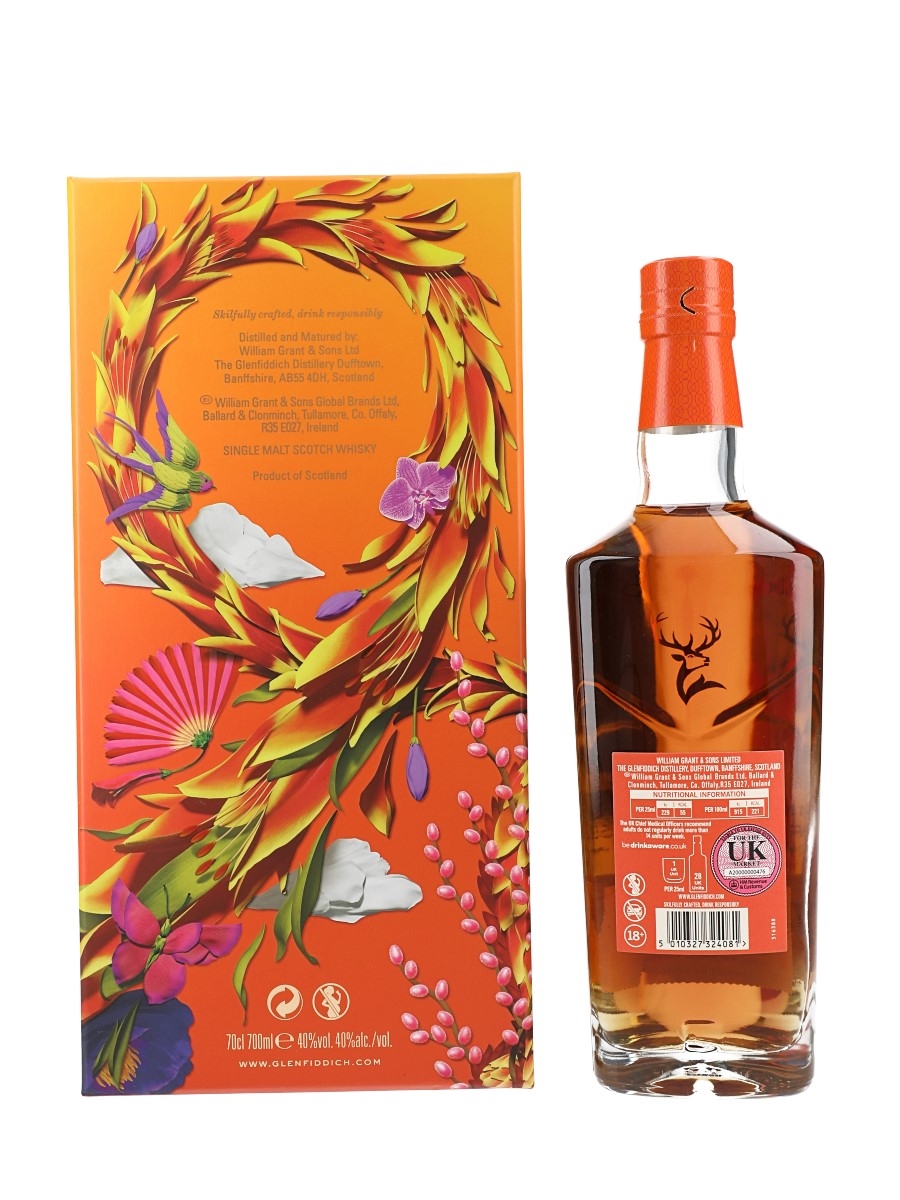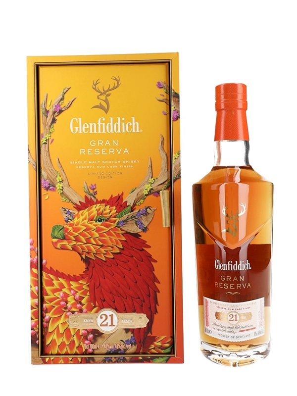 A bottle of Glenfiddich 21 Year Old Gran Reserva Single Malt Scotch Whisky which spent its final maturation period in ex-rum casks. This is a limited edition design produced for the Chinese New Year 2025.
