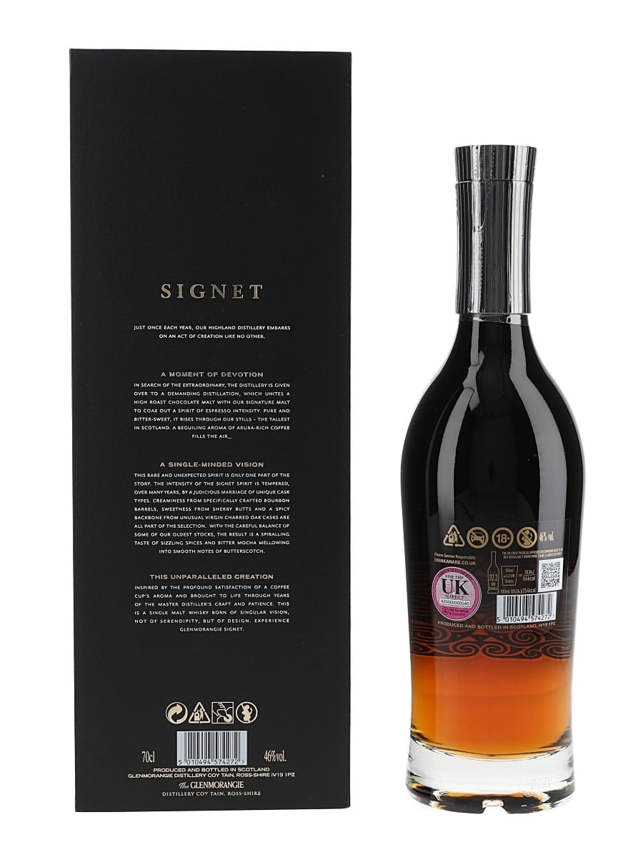 A bottle of Glenmorangie Signet Highland Single Malt Scotch Whisky. Some of the spirits in this bottling have been distilled from chocolate malt, commonly used in stouts and porters.