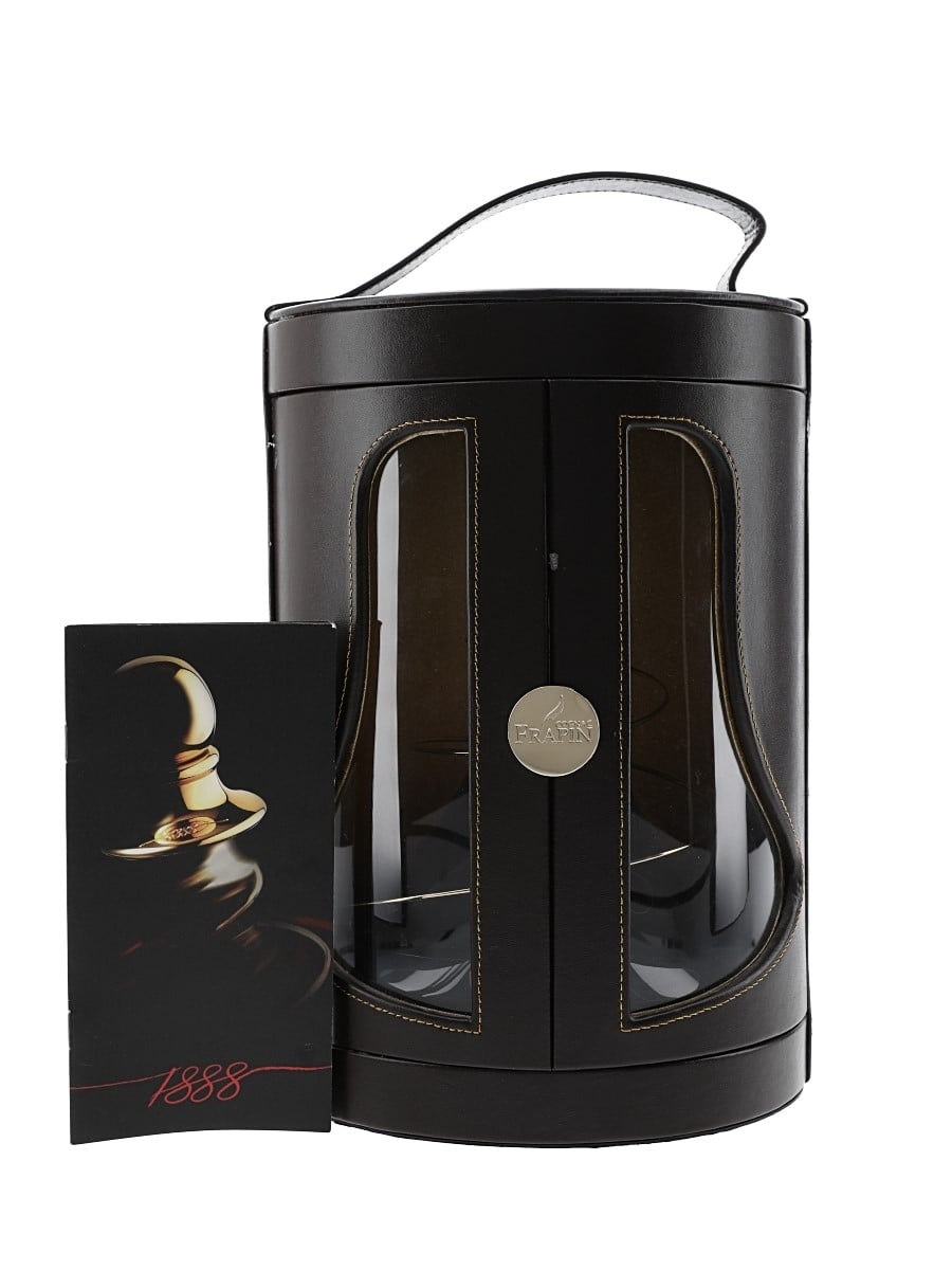 A bottle of Frapin Cuvée 1888 Premier Grand Cru Cognac. This bottling pays homage to founder Pierre Frapin, who in 1888 was preparing for the World Fair in Paris, at which Frapin won a gold medal for his Cognac.