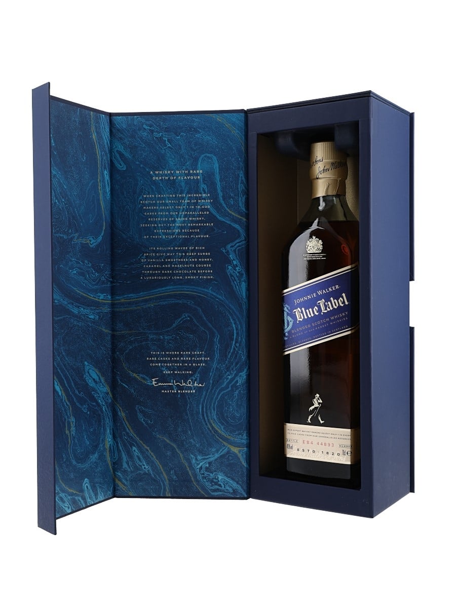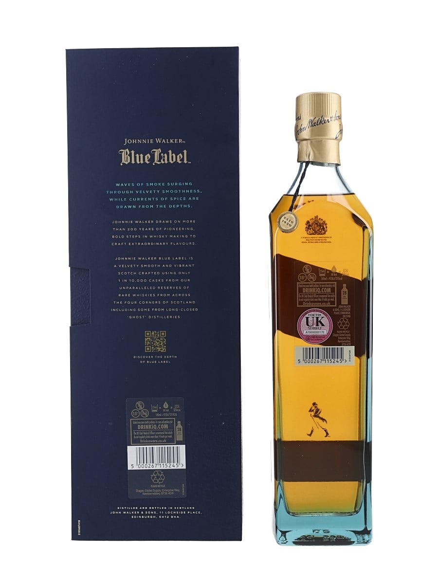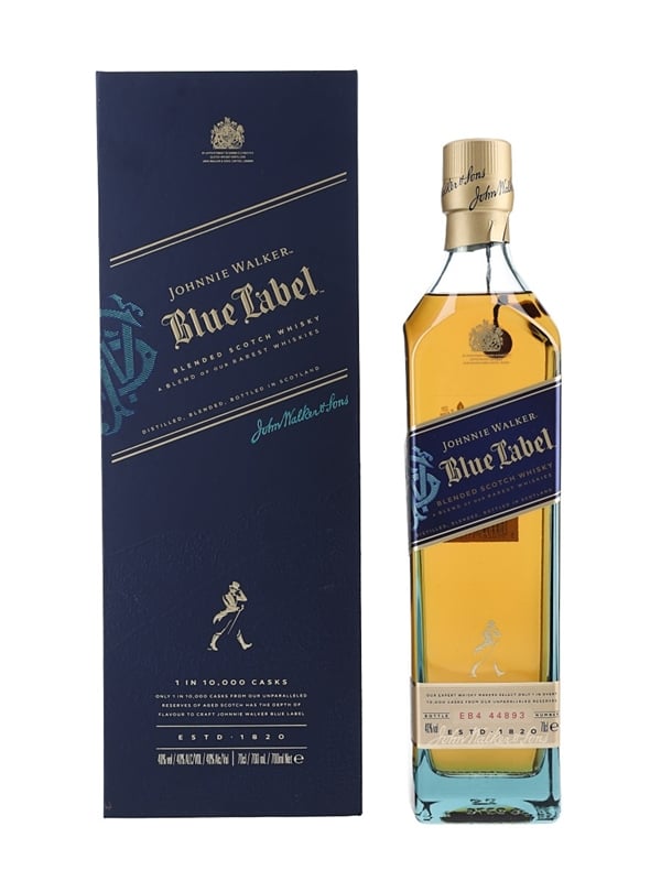 A bottle of Johnnie Walker Blue Label Blended Scotch Whisky produced by John Walker and Sons Limited.