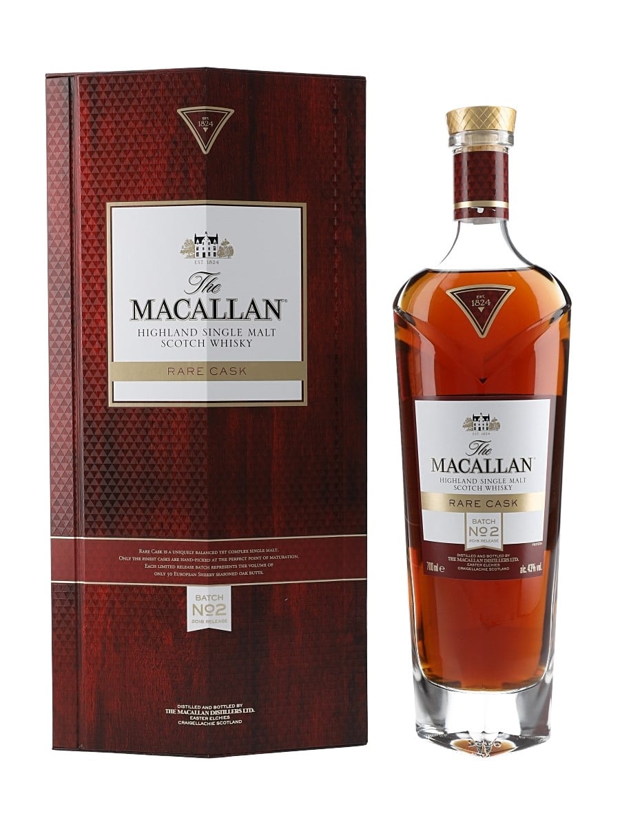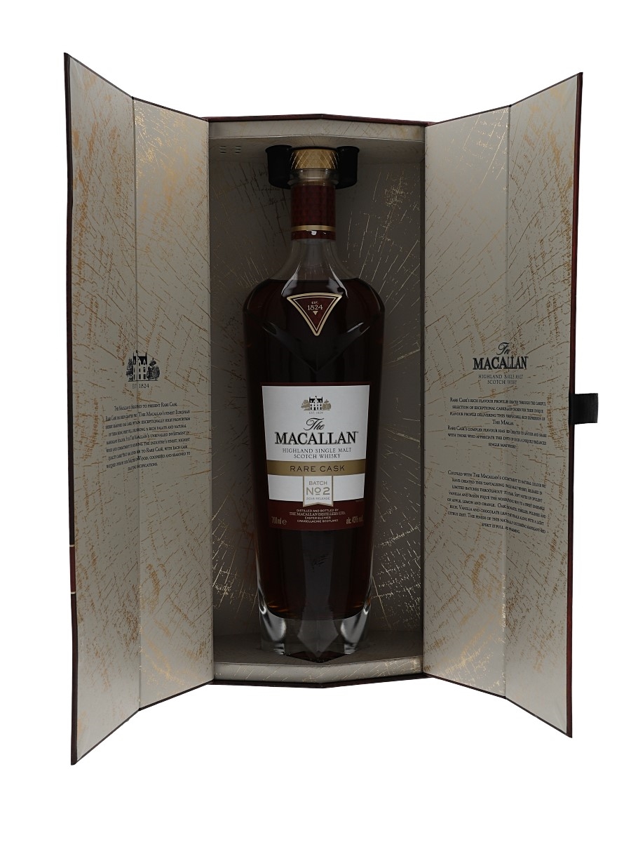 A bottle of The Macallan Rare Cask Highland Single Malt Scotch Whisky, Batch No.2, released in 2019 as a new addition to the company’s 1824 Series of core expressions. This whisky was drawn from 50 European sherry seasoned oak butts.