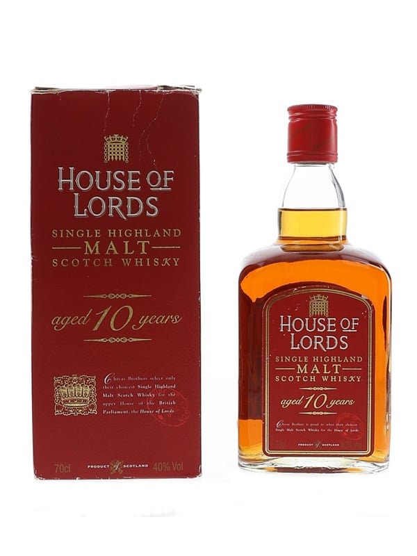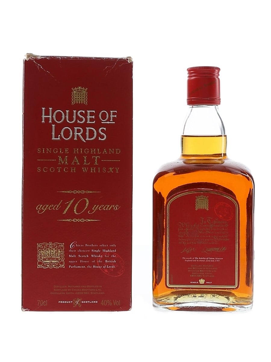 A bottle of House of Lords 10 Year Old single Highland malt Scotch whisky. This was distilled at an undisclosed distillery and selected by Chivas Brothers for the upper house of the British Parliament, the House of Lords.