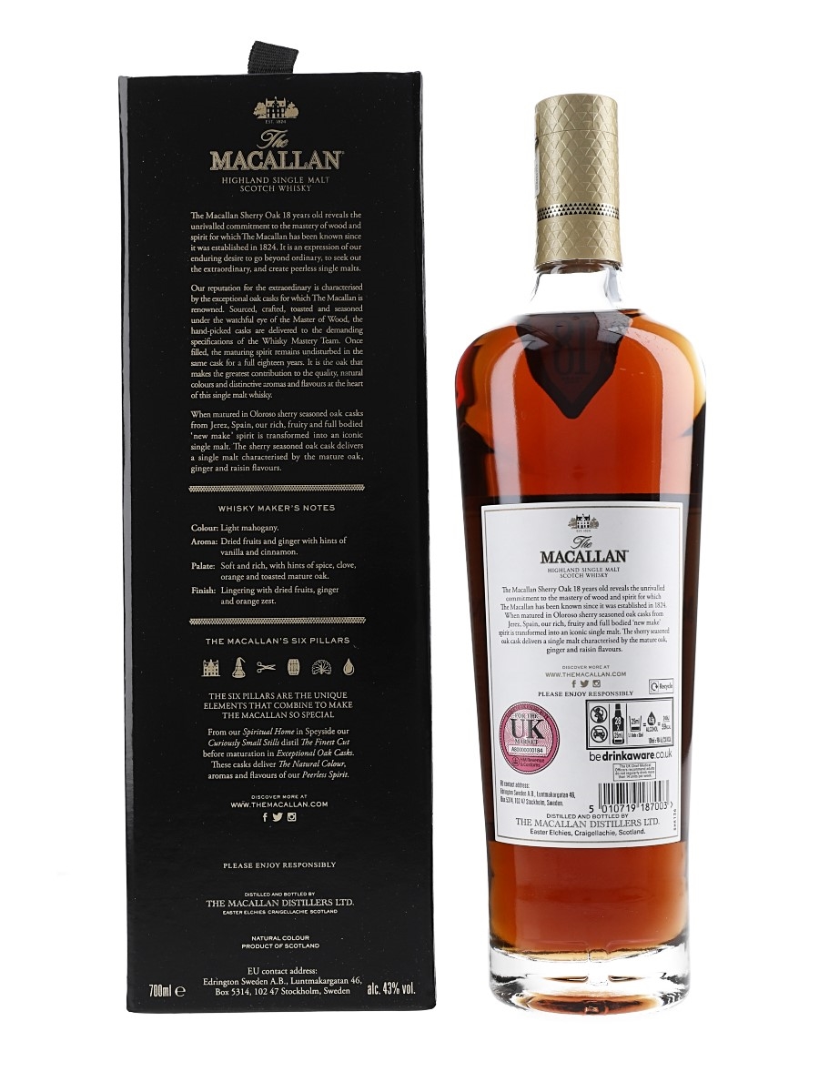 A bottle of The Macallan 18 Year Old Highland Single Malt Scotch Whisky. This was matured exclusively in hand-picked sherry seasoned oak casks from Jerez, Spain, and bottled at 43% ABV for the annual release in 2022.