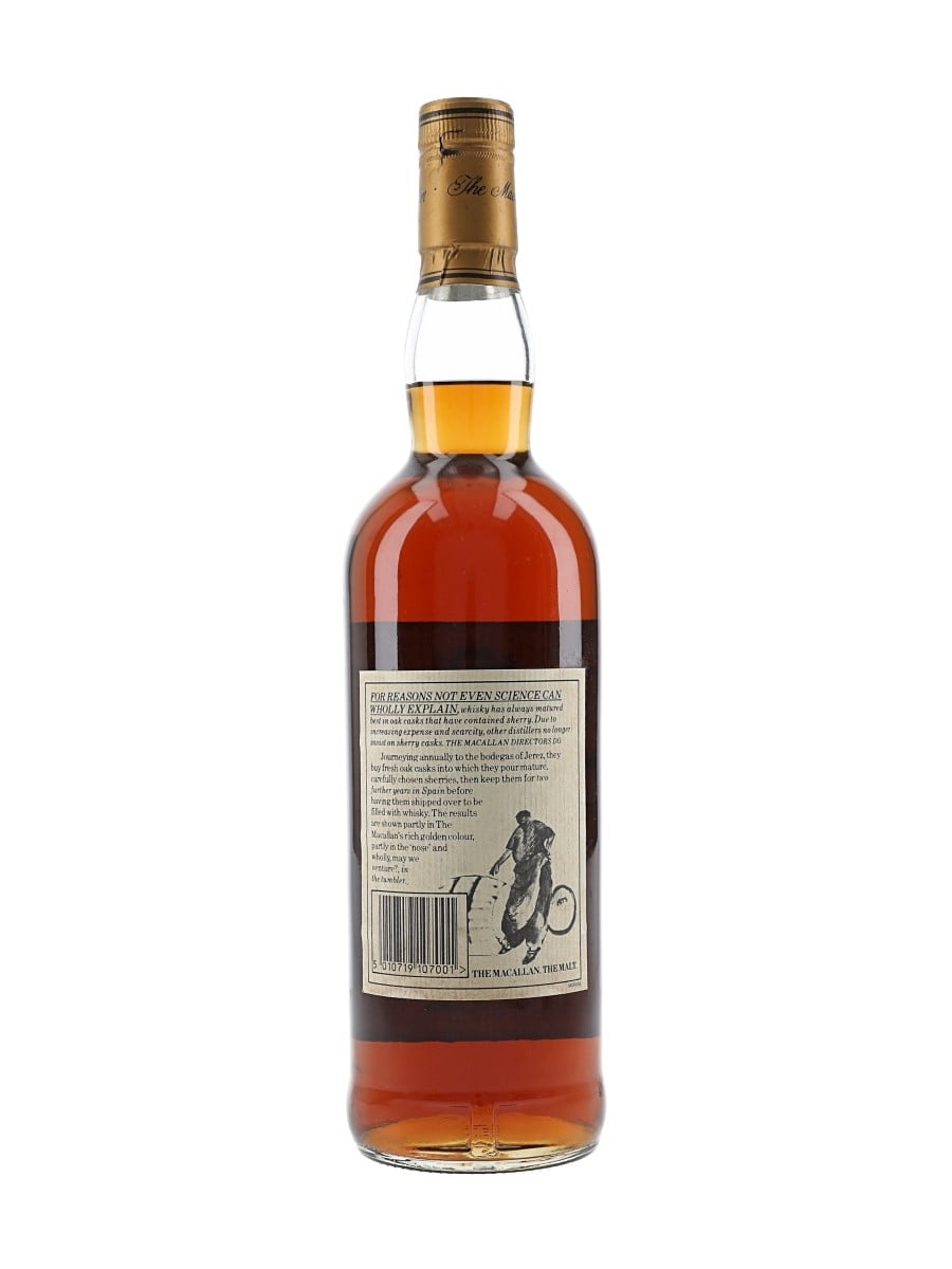 A bottle of The Macallan 10 Year Old Single Highland Malt Scotch Whisky exclusively matured in selected sherry casks from Jerez, Spain. We estimate this was bottled in the 1990s.