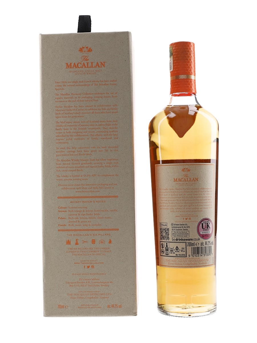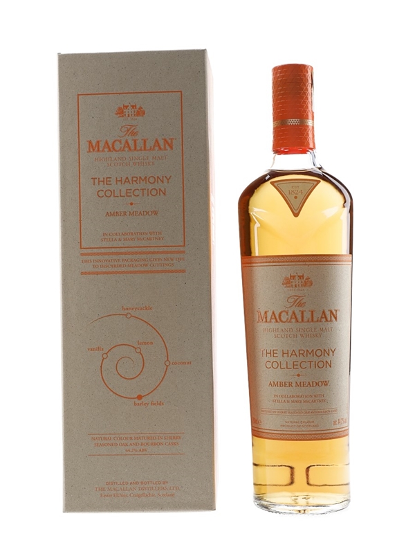 A bottle of The Macallan Amber Meadow Highland Single Malt Scotch Whisky from The Harmony Collection. This was matured in a combination of sherry seasoned oak and bourbon casks before being bottled at 44.2% ABV.