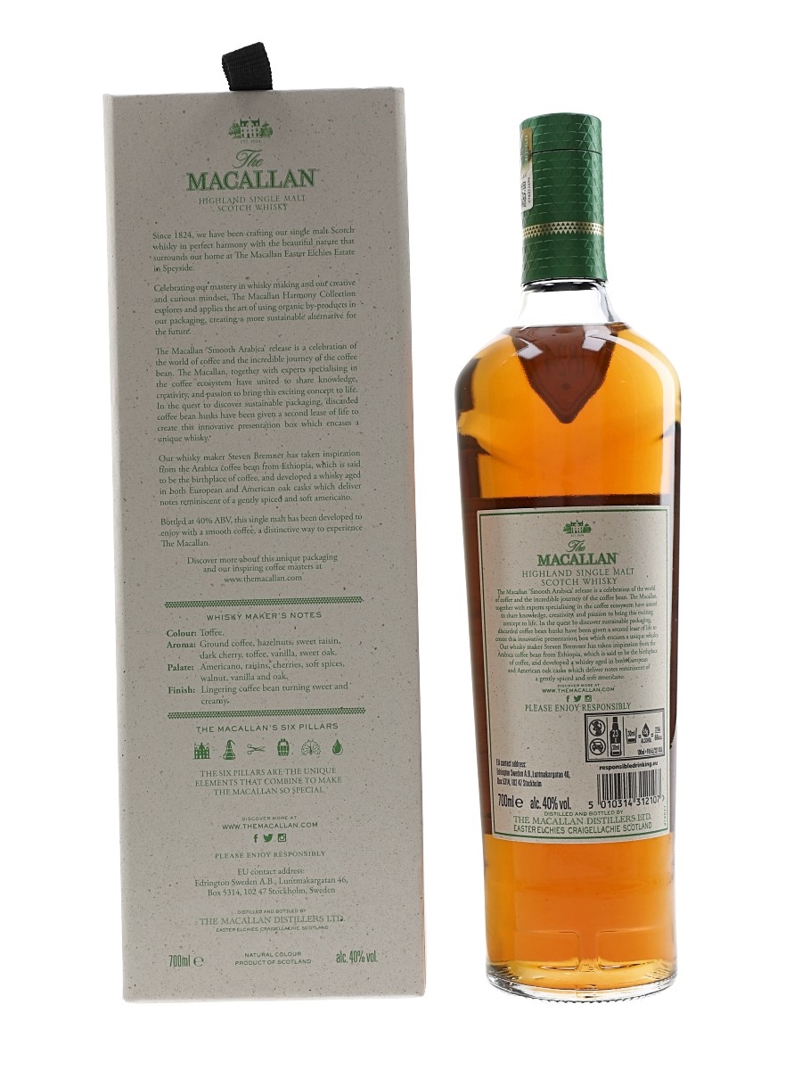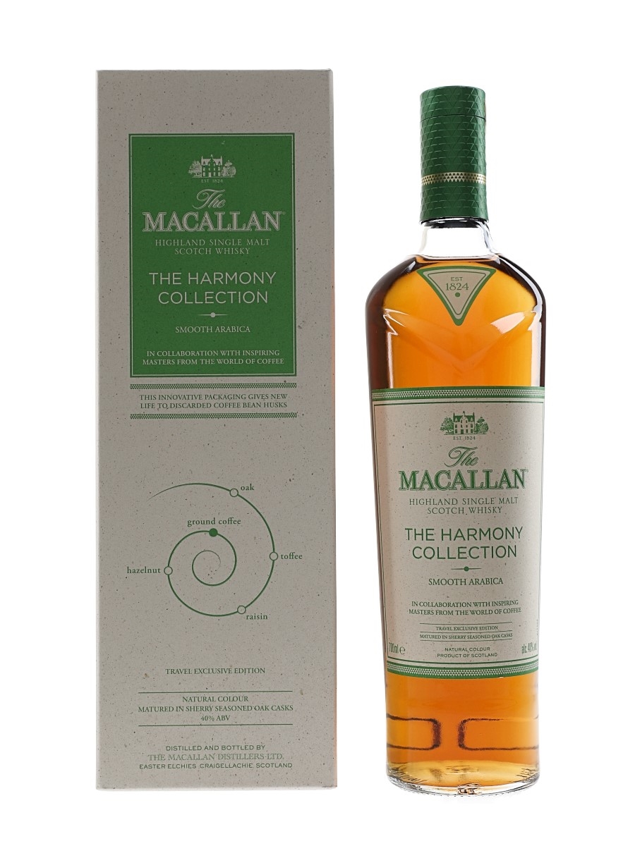 A bottle of The Macallan Smooth Arabica Highland Single Malt Scotch Whisky from The Harmony Collection. This is inspired by the Ethiopian Arabica bean, in collaboration with inspiring masters from around the world of coffee.