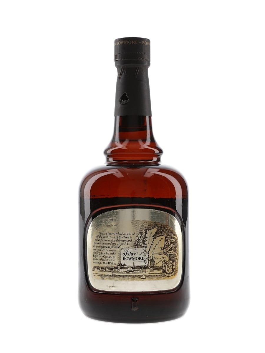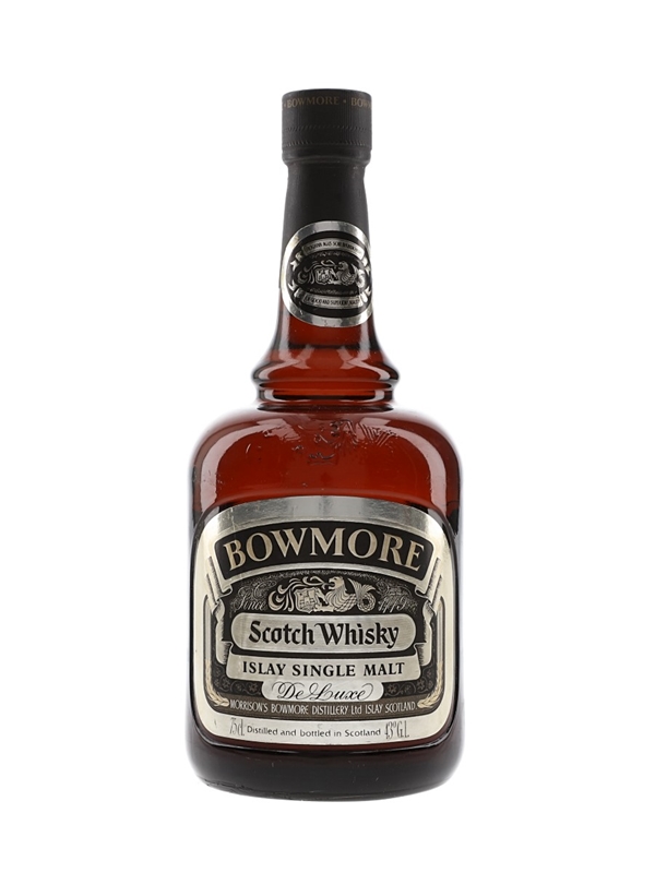 A bottle of Bowmore De Luxe Islay Single Malt Scotch Whisky. We estimate this was bottled in the 1980s.
