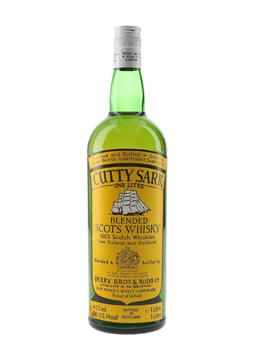 A litre bottle of Cutty Sark Blended Scots Whisky bottled by Berry Bros & Rudd. We estimate this was bottled in the 1980s.