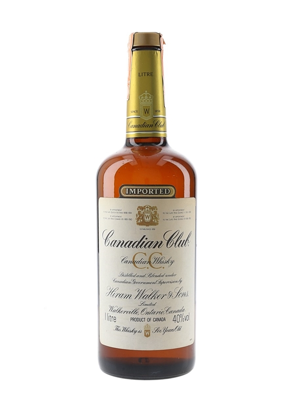 A litre bottle of Canadian Club 6 year old whisky, produced by Hiram Walker & Sons. We estimate this was bottled in the 1980s.