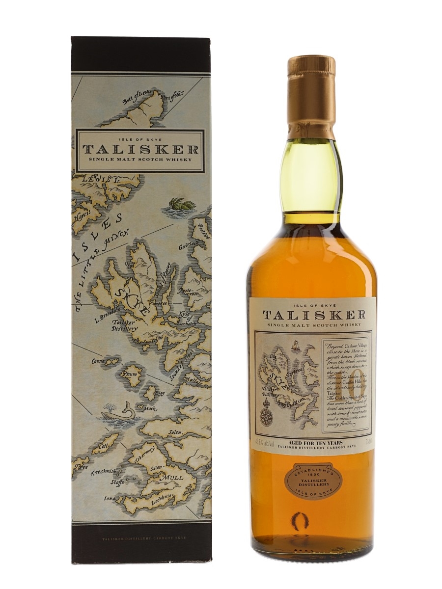 A bottle of Talisker 10 Year Old Single Malt Scotch Whisky, with the label featuring a map of the Isle of Skye. We estimate this was bottled in the 1990s. This was imported to the US by Schenley Imports Co.
