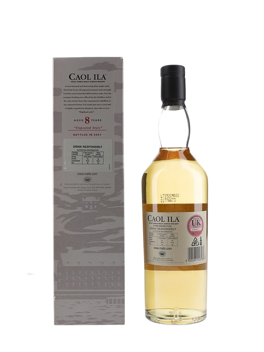 A bottle of Caol Ila 8 Year Old Unpeated Islay Single Malt Scotch Whisky, bottled in 2007.