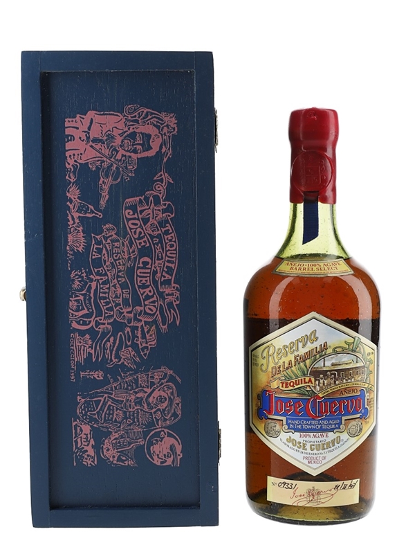 A bottle of Jose Cuervo Reserva de la Familia Añejo Tequila, bottled in 1997. The Reserva de la Familia was first produced in 1995 to commemorate the 200th anniversary of Jose Cuervo. This edition comes in a wooden presentation box.