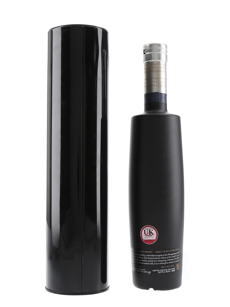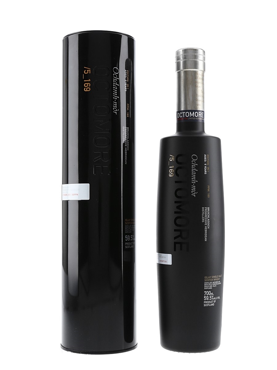 A bottle of Octomore 5 Year Old Limited Edition 05.1 Islay Single Malt Scotch Whisky bottled at a cask strength of 59.5% ABV. This is the fifth release of Octomore, a heavily peated whisky from Bruichladdich.