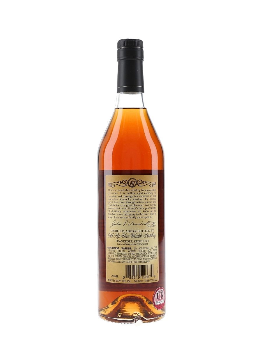 A bottle of Old Rip Van Winkle 10 Year Old Handmade Bourbon, distilled, aged and bottled by Old Rip Van Winkle Distillery, Frankfort.
