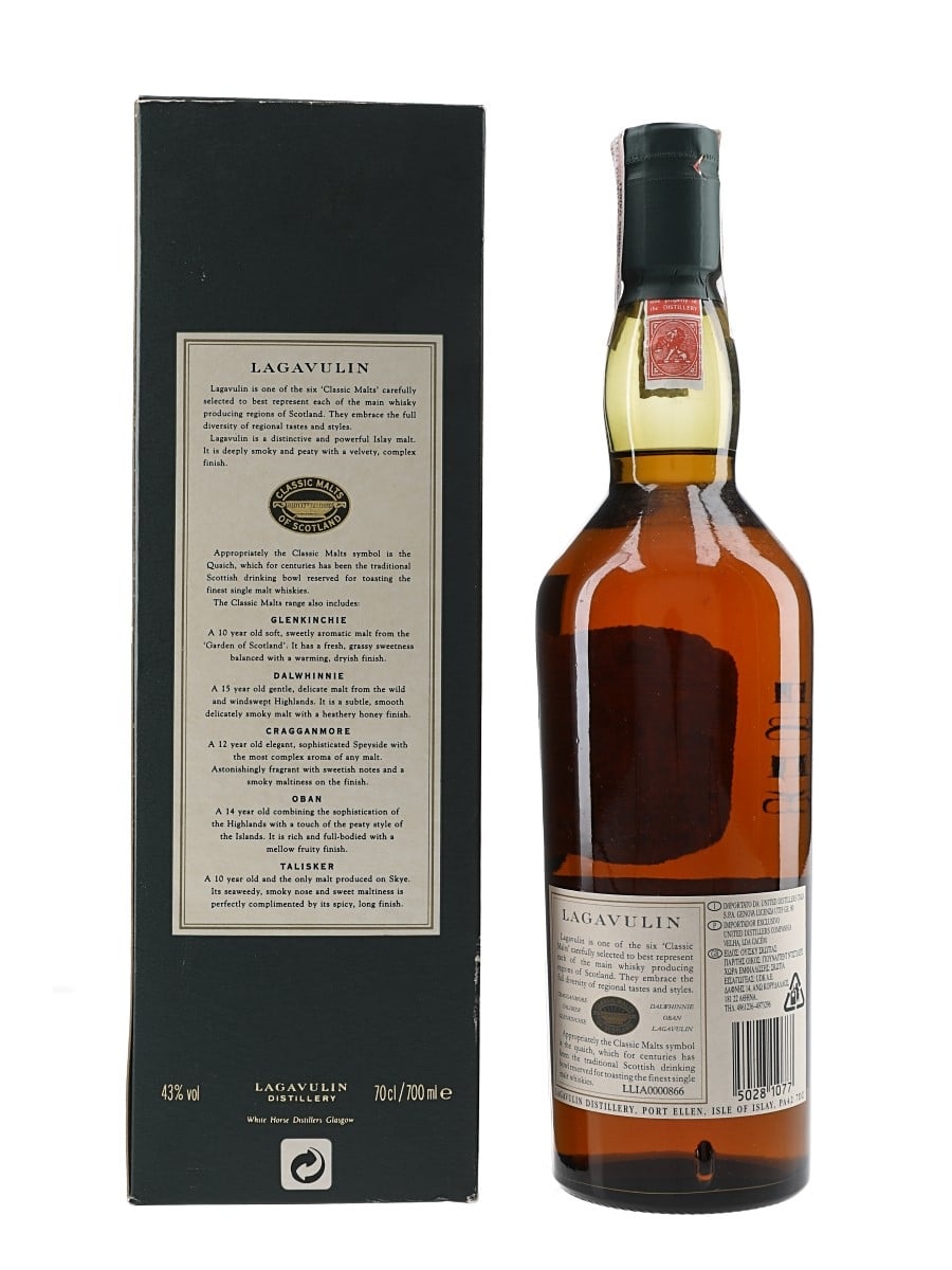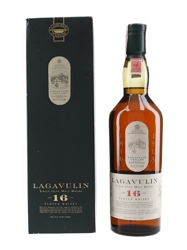 A bottle of Lagavulin 16 Year Old Single Islay Malt Scotch Whisky, part of Diageo's Classic Malts of Scotland range. We estimate this was bottled in the 1990s, when the distillery was still owned by White Horse Distillers.