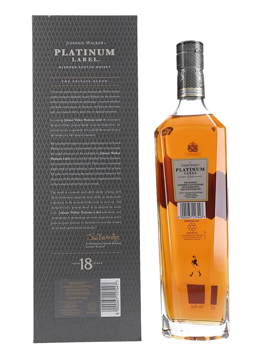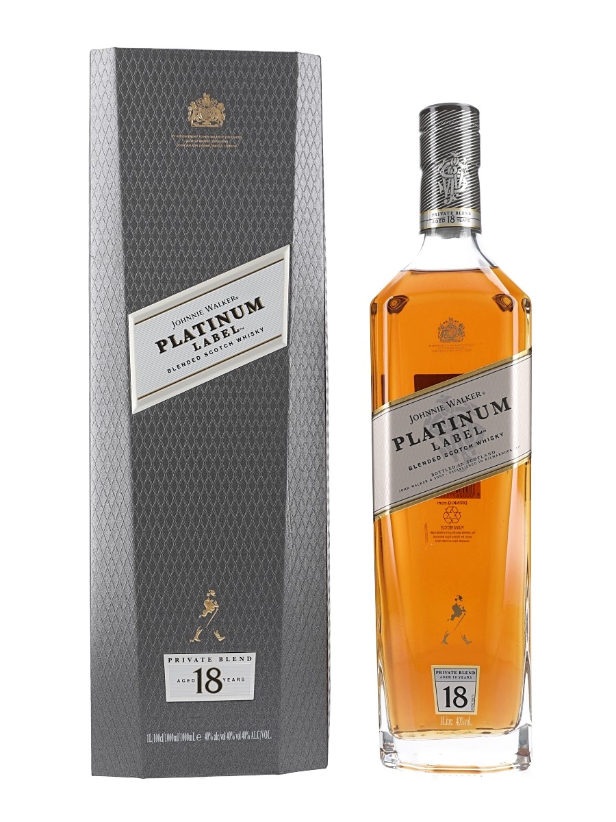 A litre bottle of Johnnie Walker Platinum Label 18 Year Old Blended Scotch Whisky in a presentation box.
