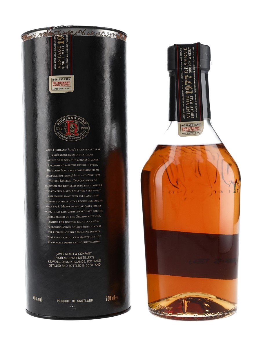 A bottle of Highland Park Vintage 1977 Reserve Single Malt Scotch Whisky. This was distilled in 1977, matured for 21 years, and bottled in 1998 to celebrate the distillery's 200th anniversary.