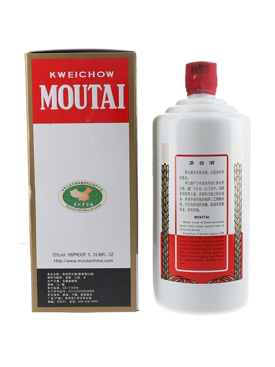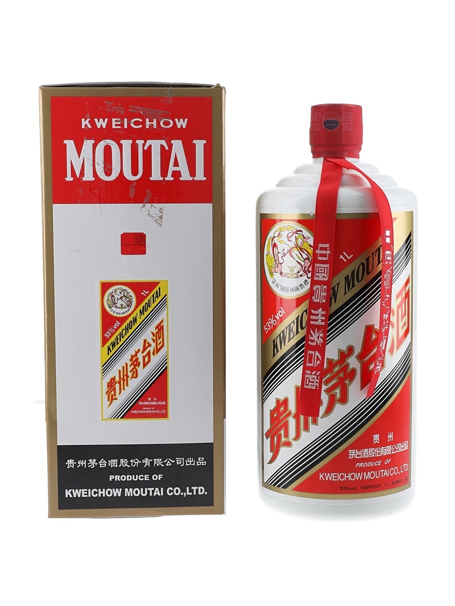 A litre bottle of Kweichow Moutai 2017 in a presentation box.