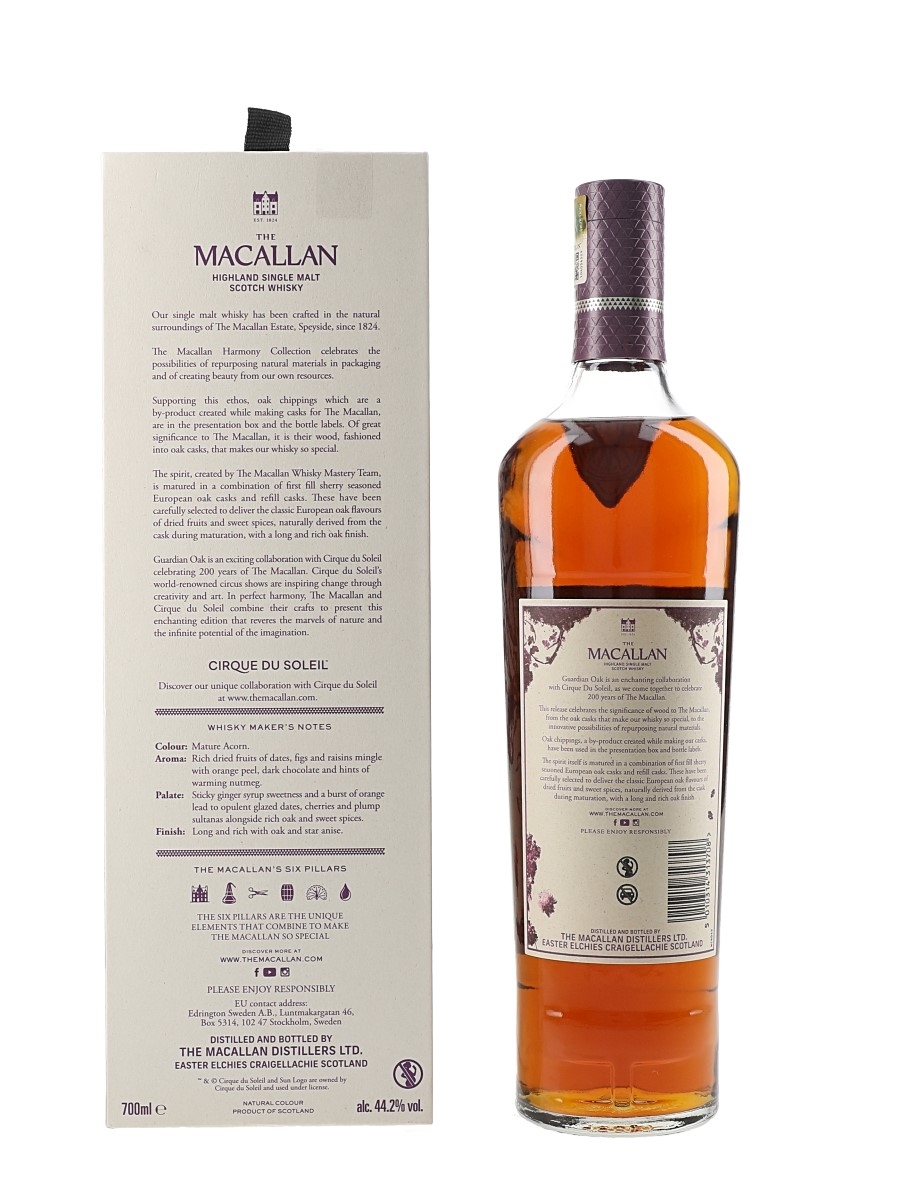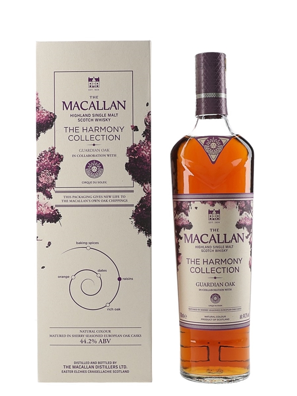 A bottle of The Macallan Guardian Oak Highland Single Malt Scotch Whisky from The Harmony Collection. This was matured in a sherry seasoned oak casks before being bottled at 44.2% ABV.