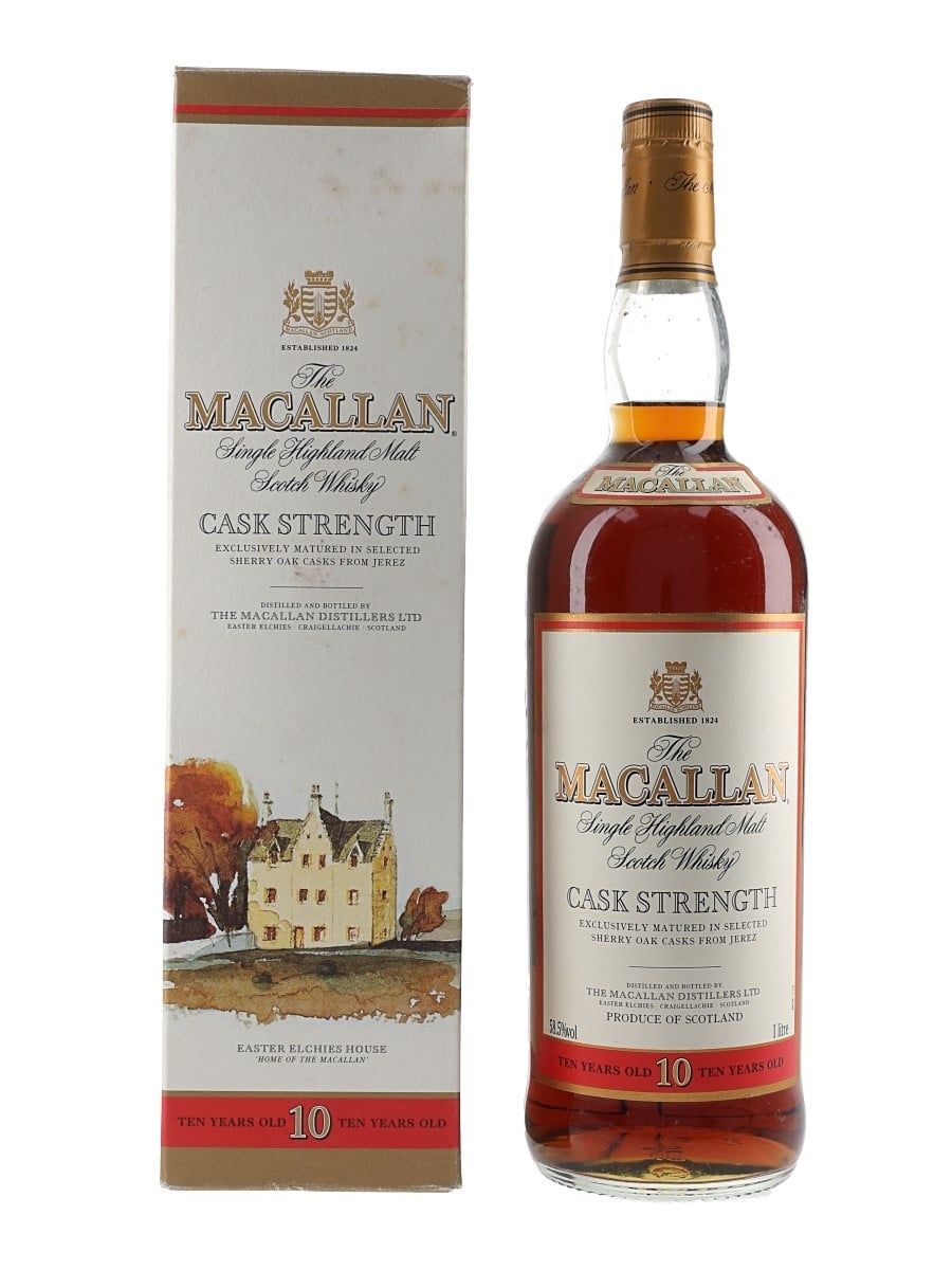 A litre bottle of The Macallan 10 Year Old Cask Strength, bottled at 58.5% ABV. We estimate this was bottled in the 2000s.