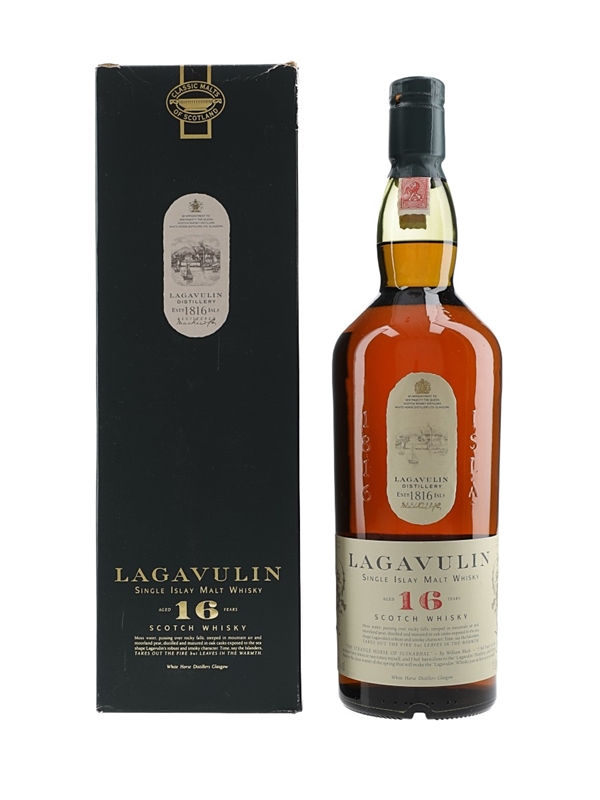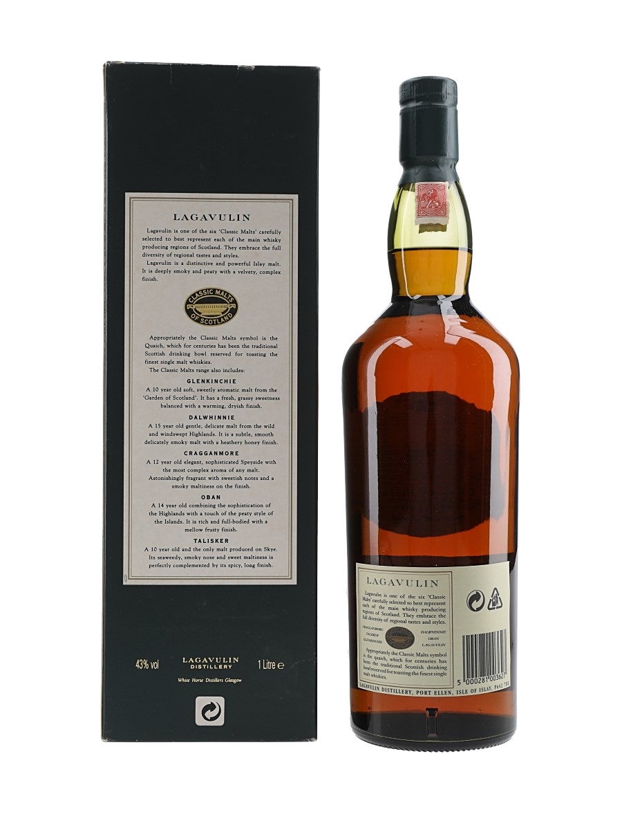 A litre bottle of Lagavulin 16 Year Old Single Islay Malt Scotch Whisky, part of Diageo's Classic Malts of Scotland range. We estimate this was bottled in the 1980s, when the distillery was still owned by White Horse Distillers.