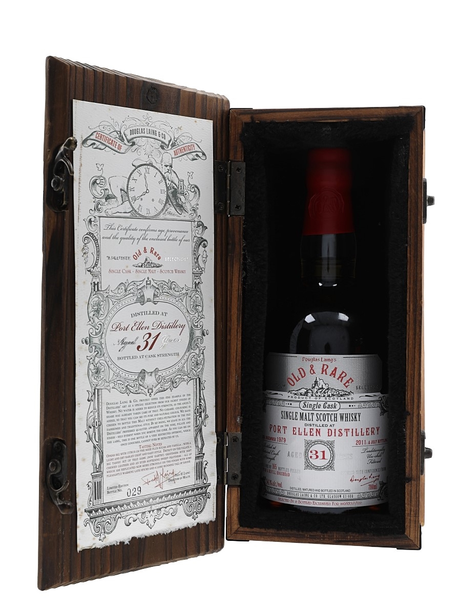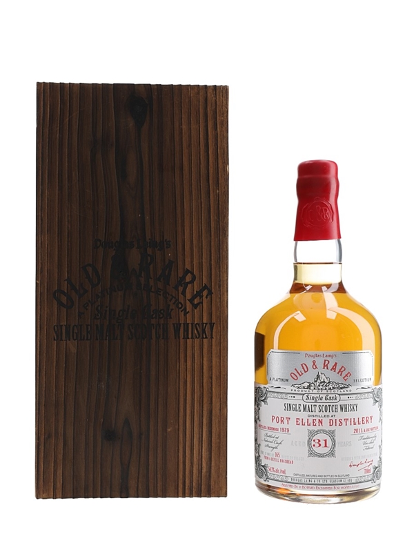 A bottle of Port Ellen 31 Year Old Single Malt Scotch Whisky. This was distilled in December 1979 and bottled in July 2011 by Douglas Laing as part of the Old & Rare Platinum Selection series.