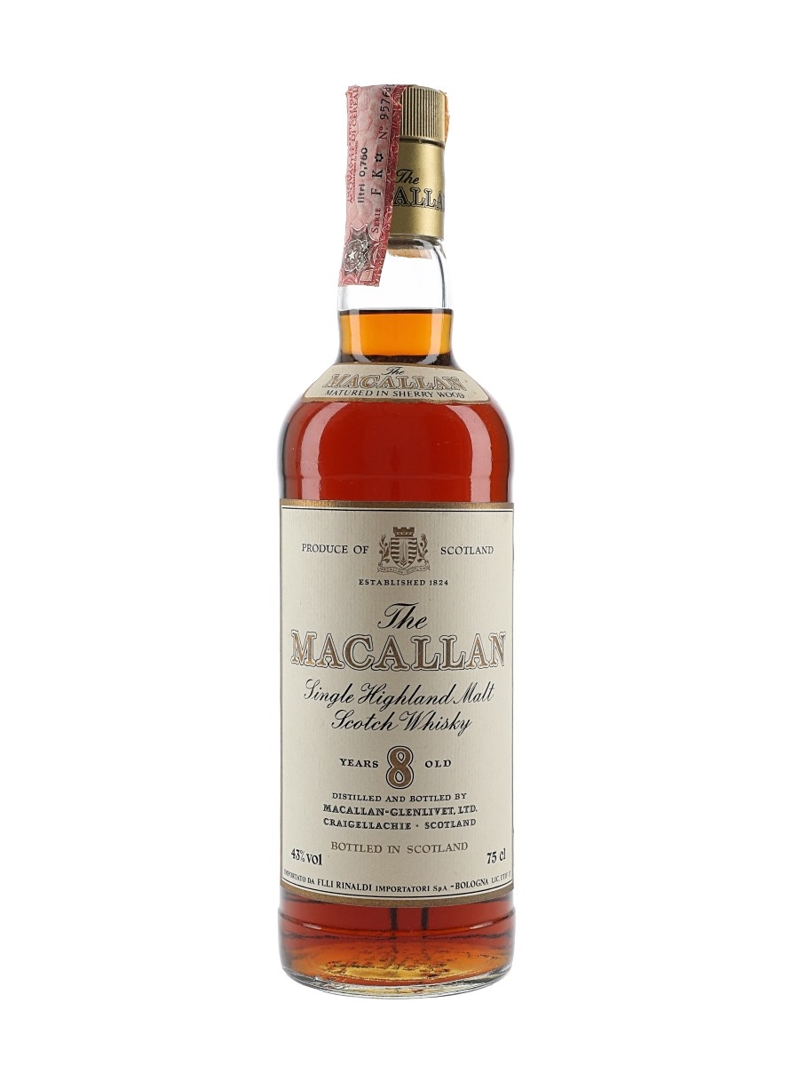 A bottle of The Macallan 8 Year Old Single Highland Malt Scotch Whisky. This was matured in sherry wood and imported to Italy by Rinaldi, we estimate in the 1980s.