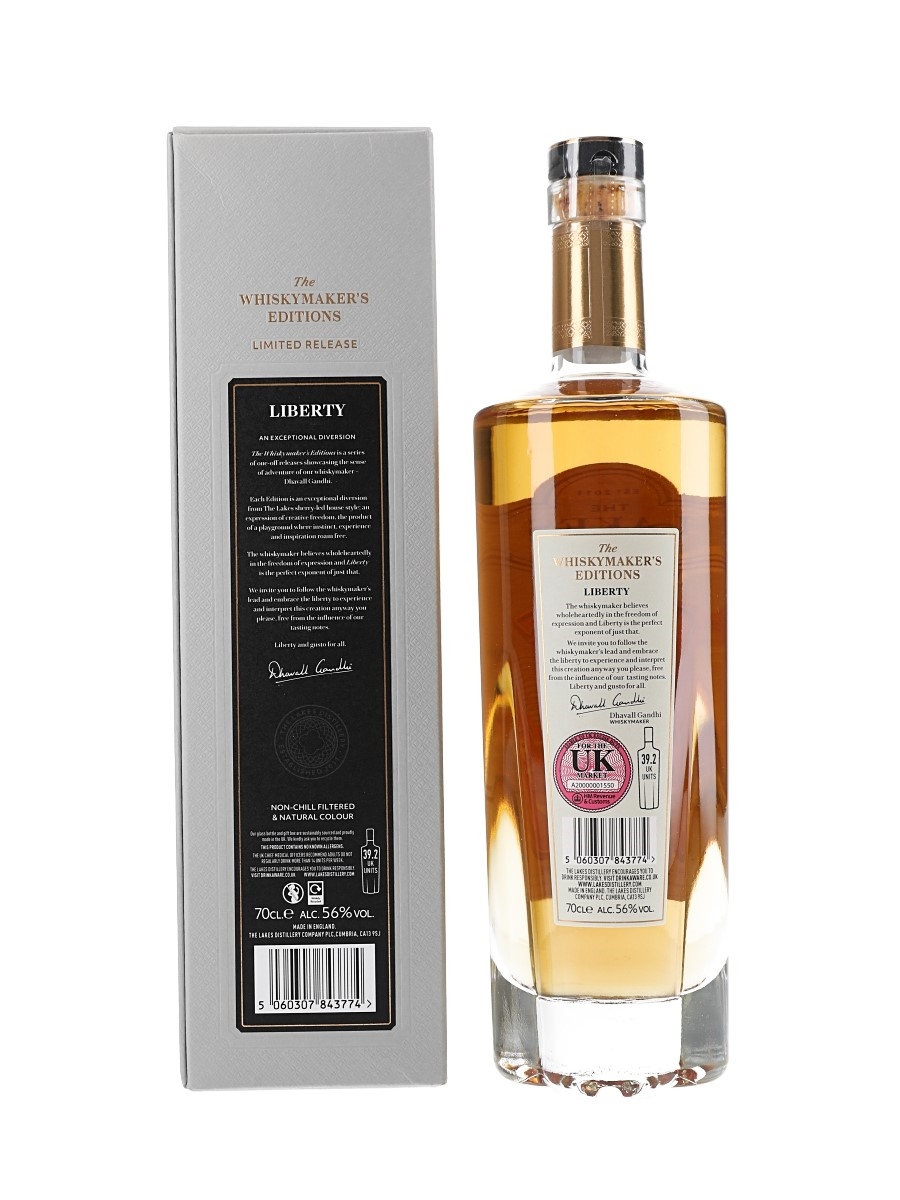 A limited edition bottle of The Lakes Single Malt The Whisky Maker's Editions, Liberty, bottled at 56% ABV.