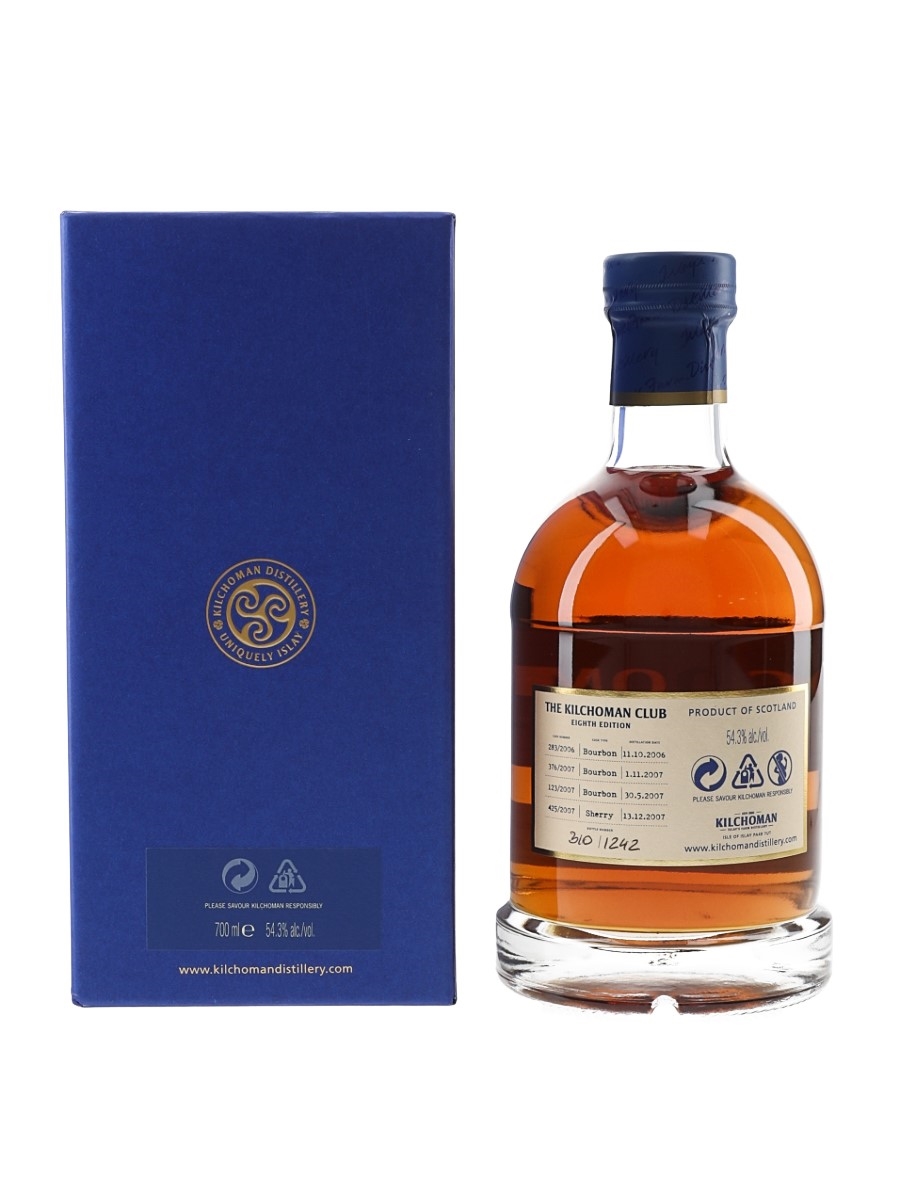 A bottle of Kilchoman Small Batch Release eighth edition. A mix of four bourbon and sherry casks distilled between 2006-2007. This was exclusively bottled for The Kilchoman Club on 27th November 2019.