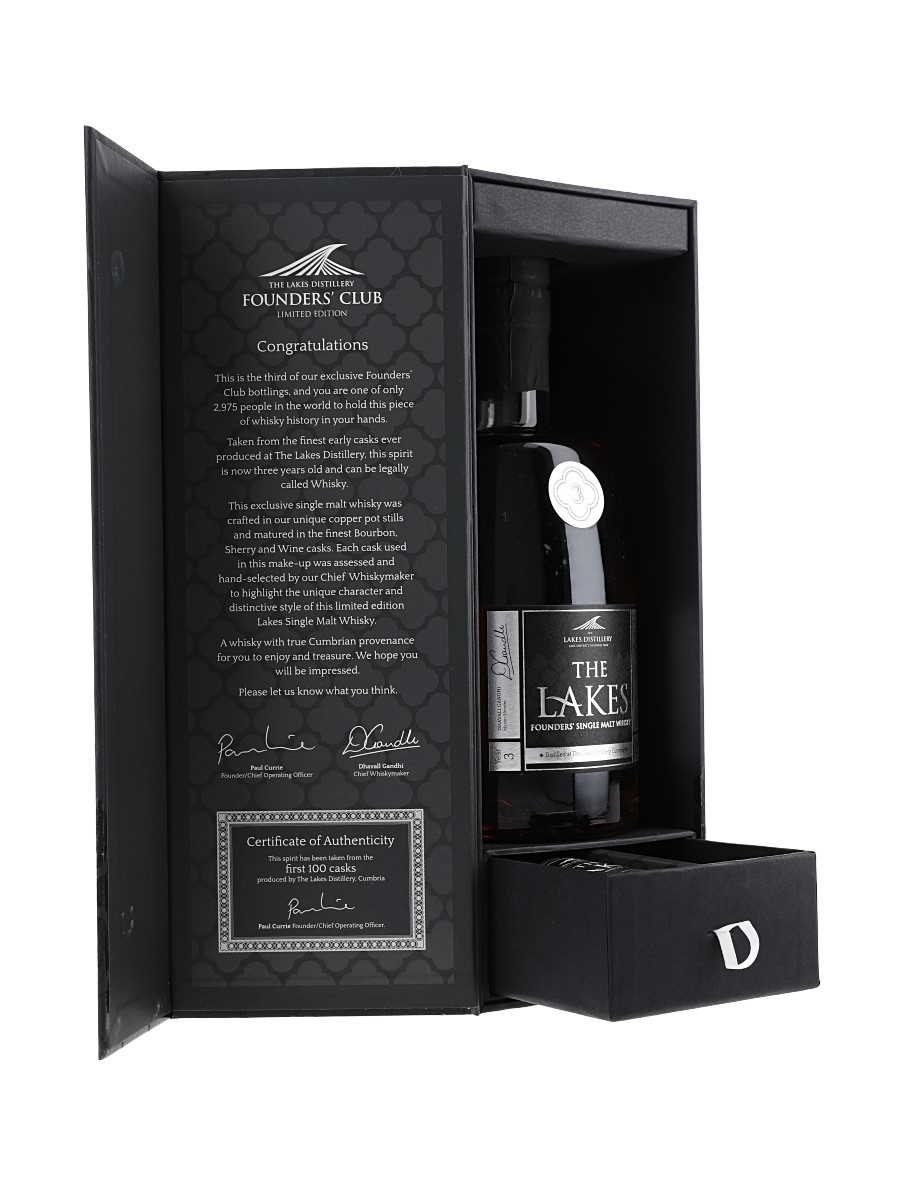 A bottle of The Lakes Founders' Club Single Malt Whisky Year 3 from the first 100 casks produced at The Lakes Distillery. This was matured in bourbon, sherry and wine casks for three years and bottled at 46.6% ABV. This is one of 2975 bottles produced.