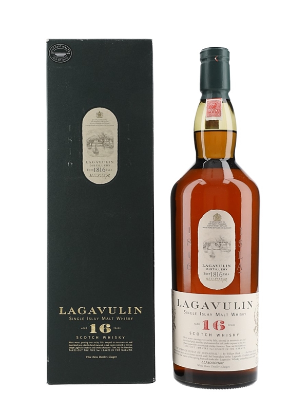 A litre bottle of Lagavulin 16 Year Old Single Islay Malt Scotch Whisky, part of Diageo's Classic Malts of Scotland range. We estimate this was bottled in the 1980s, when the distillery was still owned by White Horse Distillers.
