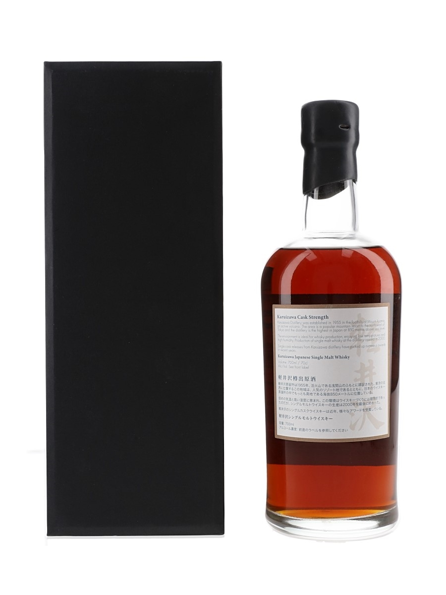 A bottle of Karuizawa from the 36 Views of Mount Fuji series. Each bottle in this series was produced from Karuizawa's final two vintages, 1999 and 2000, and are bottled at cask strength. The labels feature artwork by Japanese ukiyo-e artist Hokusai, depicting Mount Fuji from different aspects.