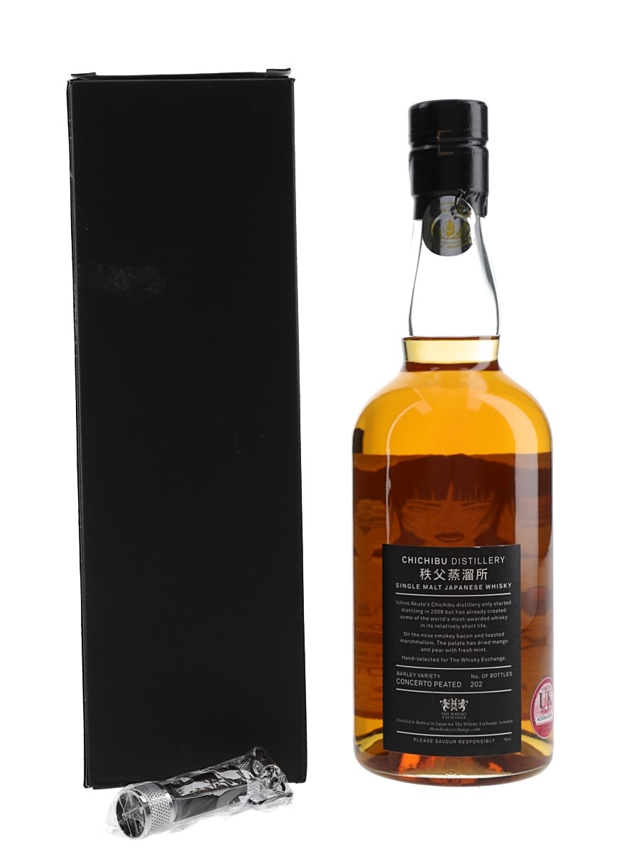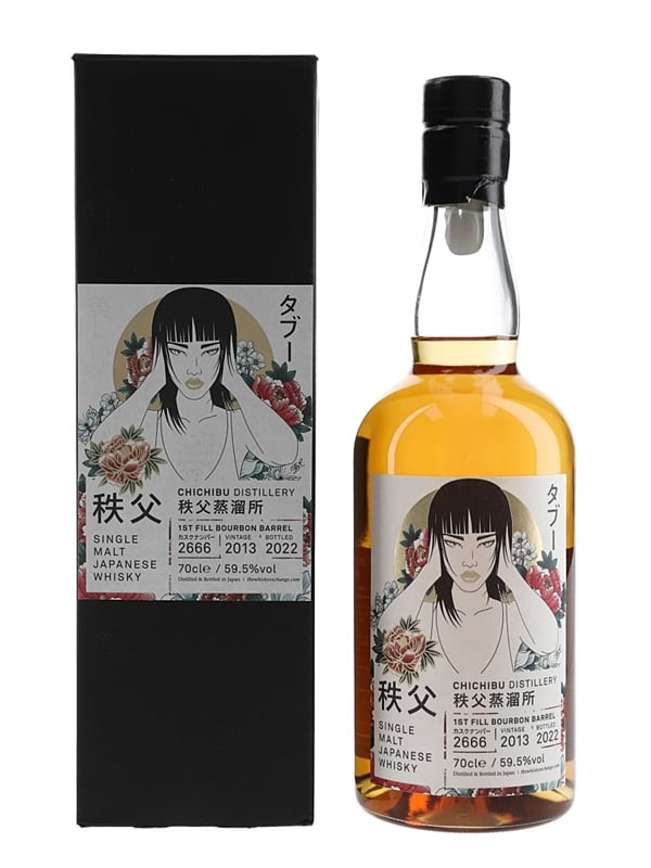 A bottle of Chichibu Japanese single malt whisky. This was distilled in 2013, matured in a single cask and bottled in 2022 for The Whisky Exchange's Taboo series; this one is 'Hear No Evil.' A mini UV torch is included which reveals hidden artwork on the label.