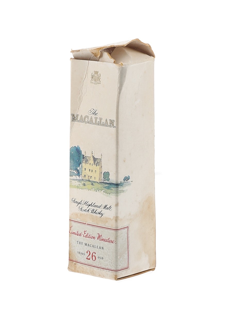 A miniature bottle of The Macallan 26 Year Old Single Highland Malt Scotch Whisky. This was distilled in 1966, matured in sherry wood and bottled at 43% ABV.