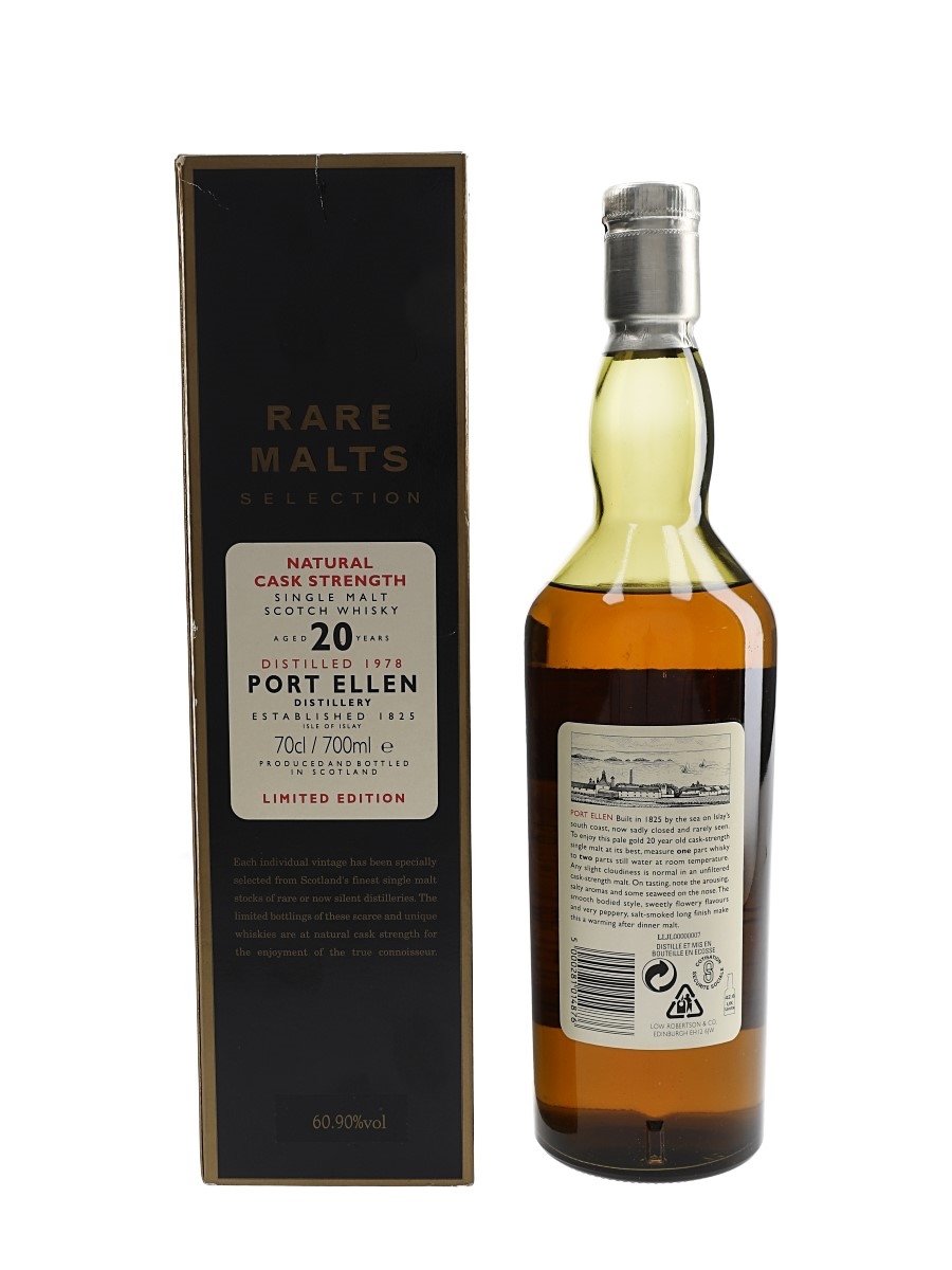 A bottle of Port Ellen 20 Year Old Single Malt Scotch Whisky. This was distilled in 1978 and bottled for Diageo's now-discontinued Rare Malts Selection in October 1998.