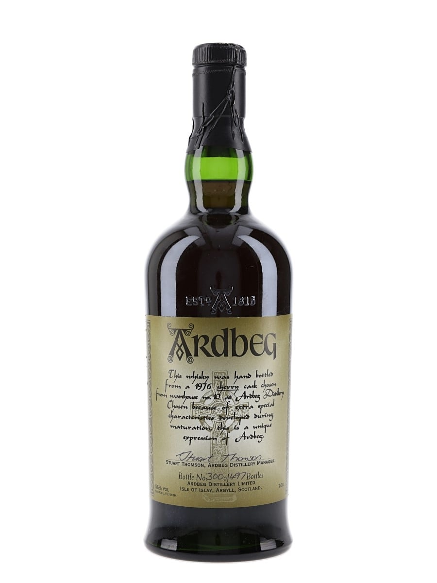 A bottle of Ardbeg Single Cask Single Malt Scotch Whisky. This was distilled on 24 November 1976, matured in a Sherry butt and bottled at a cask strength of 56% on 23 June 1999.