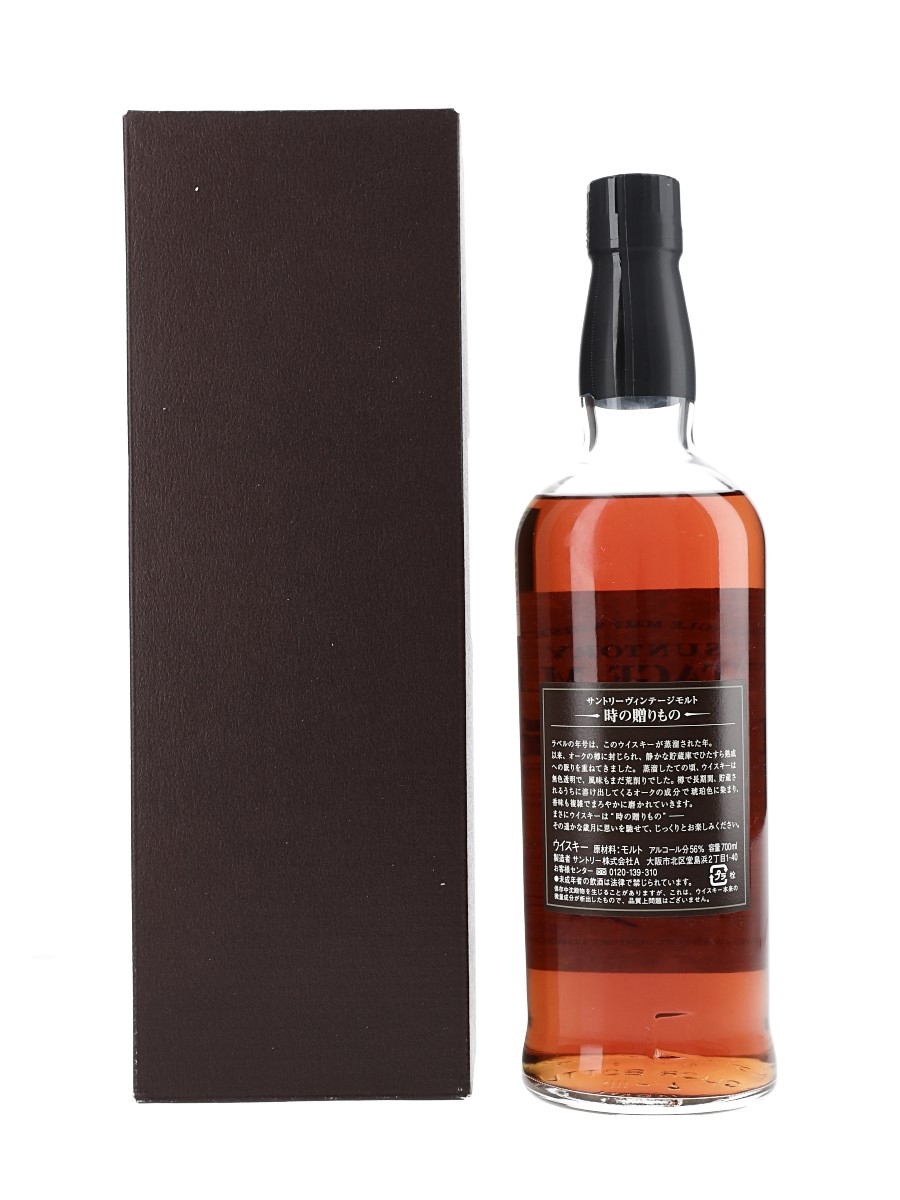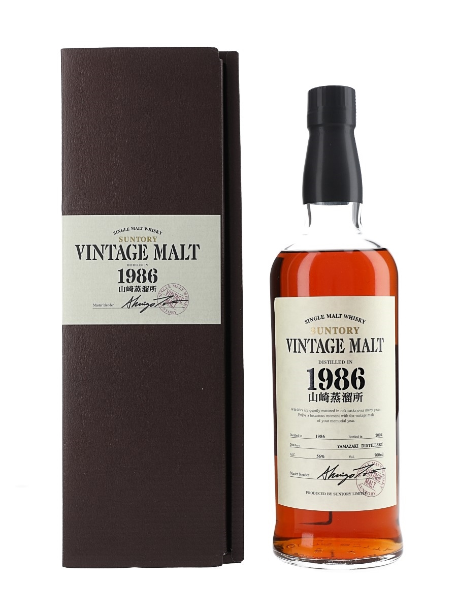 A bottle of Yamazaki Suntory Vintage Malt, distilled in 1986 and bottled in 2004 at 56% ABV.