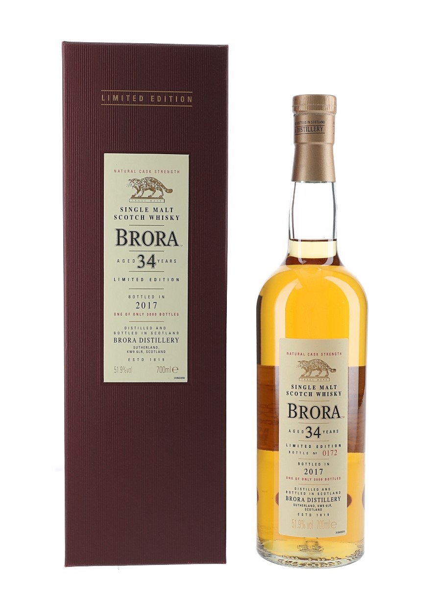 A bottle of Brora 34 Year Old Single Malt Scotch Whisky. This was bottled in 2017 as the sixteenth release of Brora from Diageo's Special Releases series.