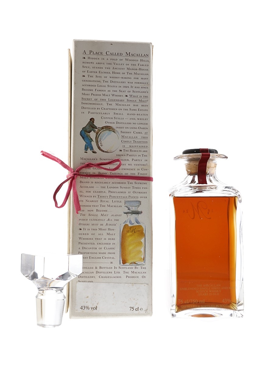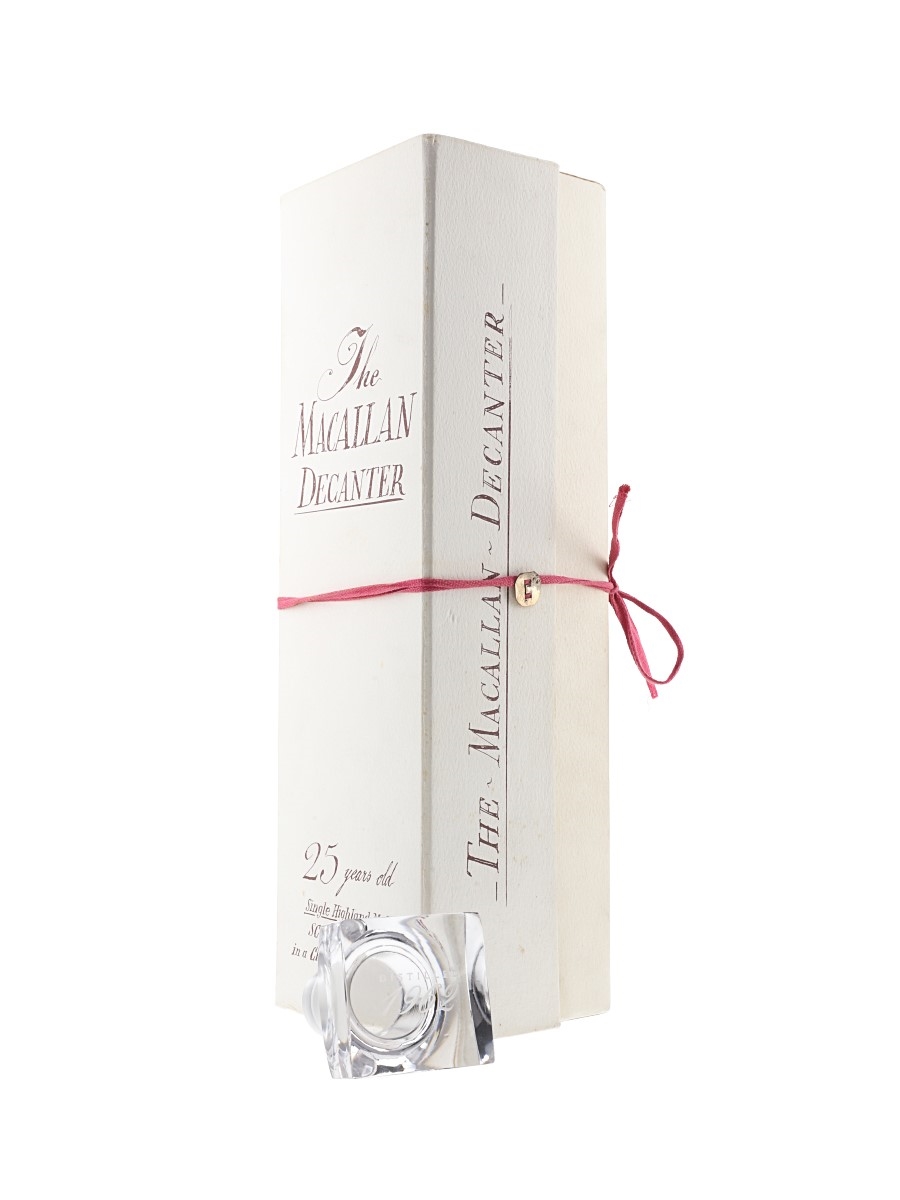 A bottle of The Macallan 25 Year Old Single Highland Malt Scotch Whisky. This was distilled in 1962 and bottled in 1987. This whisky is presented in a square crystal decanter with stopper made by Tudor Crystal. The decanter was hand-blown by a single craftsman and the letter M was hand-engraved with a diamond stylus.