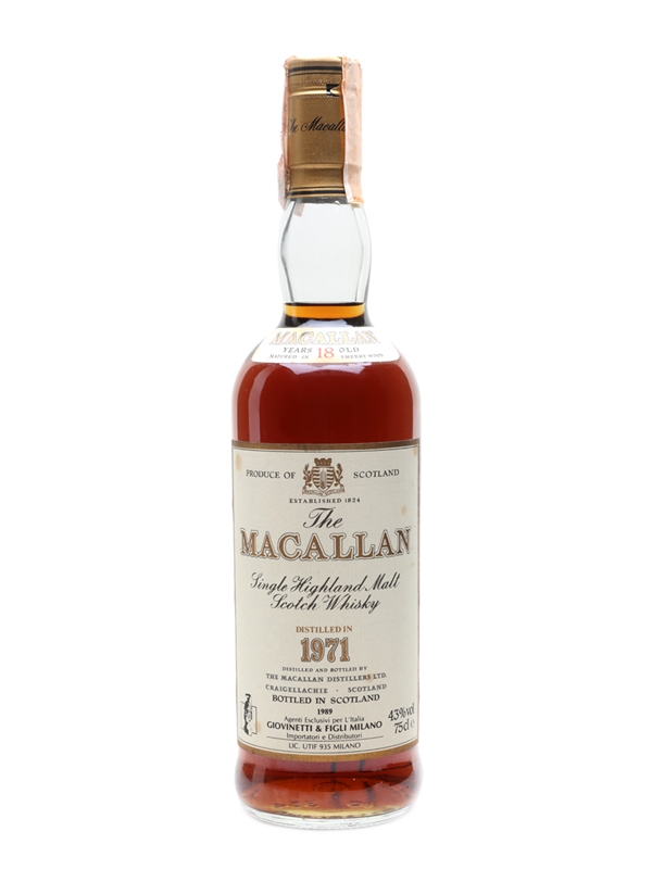A bottle of The Macallan 18 Year Old, distilled in 1971 and bottled in 1989. This was bottled for the Italian market and imported by Giovinetti & Figli.