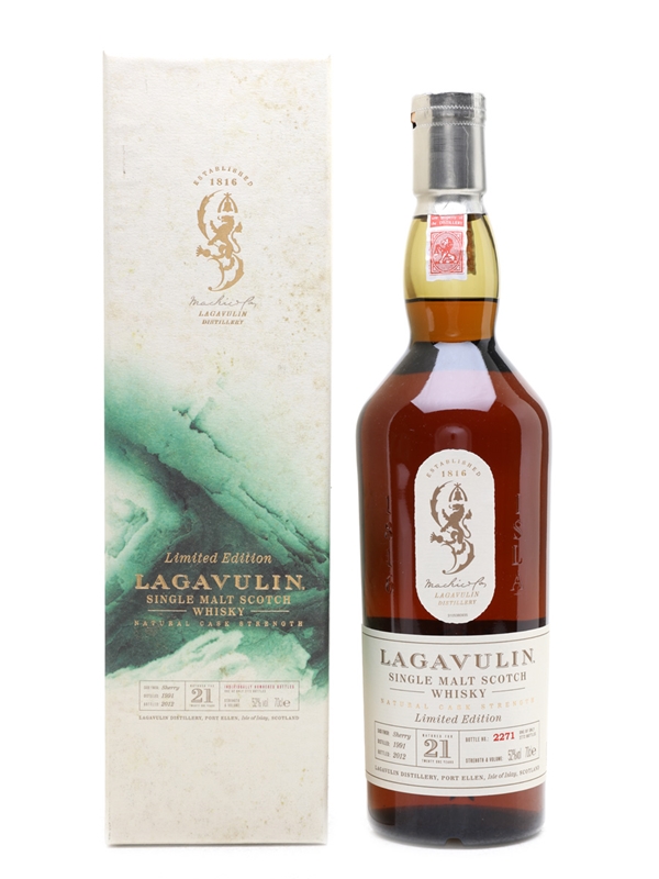 A bottle of 1991 Lagavulin aged for 21 years and released at natural cask strength for Diageo's Special Releases in 2012. Matured in European oak sherry casks.