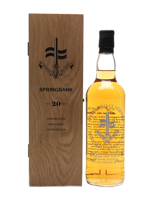A bottle of Springbank 20 Year Old. This was distilled in 1995, matured in a single cask, and bottled on 19 July 2016 for the Special Boat Service (SBS), a special forces unit of the Royal Navy.