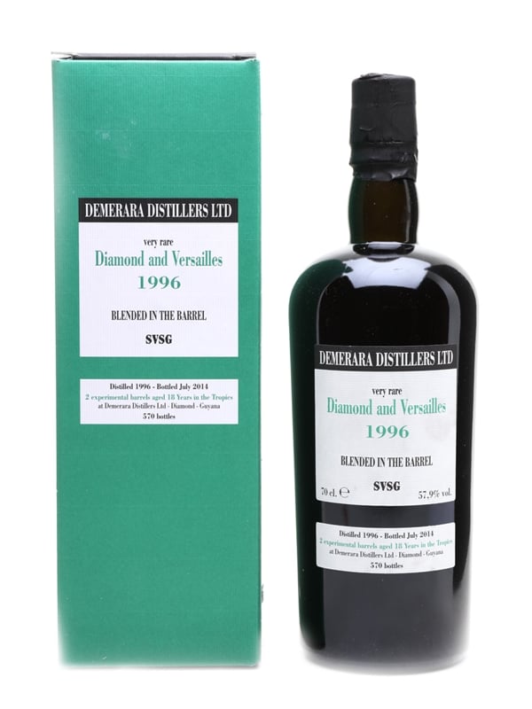 A bottle of Diamond and Versailles 1996, an experimental rum produced in two independent stills (Diamond metal Coffey still, and Versailles wooden single pot still) and blended in the barrel before bottling by Velier in July 2014.