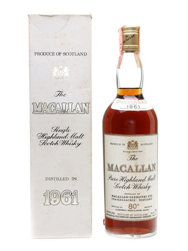 A bottle of The Macallan 1961, bottled by Campbell, Hope & King. This was bottled for the Italian market and imported by Rinaldi, we estimate in the 1970s.