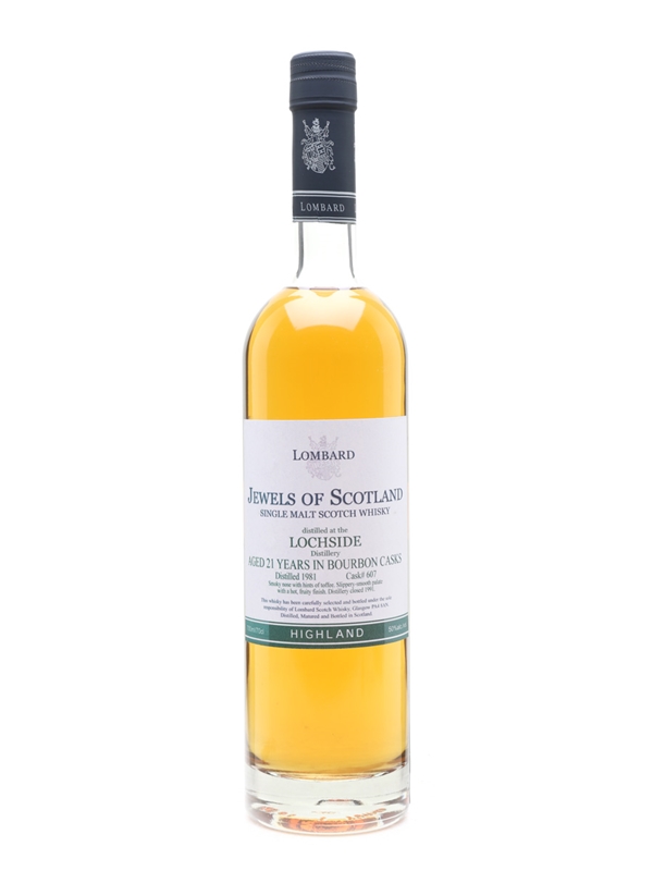 A bottle of Lochside 21 Year Old. This was distilled in 1981 and matured in a single bourbon cask before bottling by Lombard Scotch Whisky for the Jewels of Scotland series.