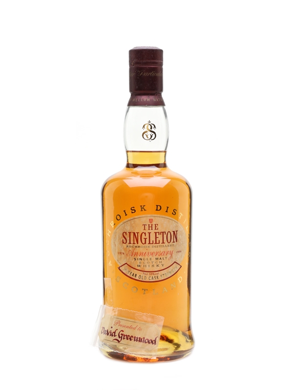A bottle of The Singleton of Auchroisk 20 Year Old, bottled at cask strength to celebrate the distillery's 20th anniversary in 1994.