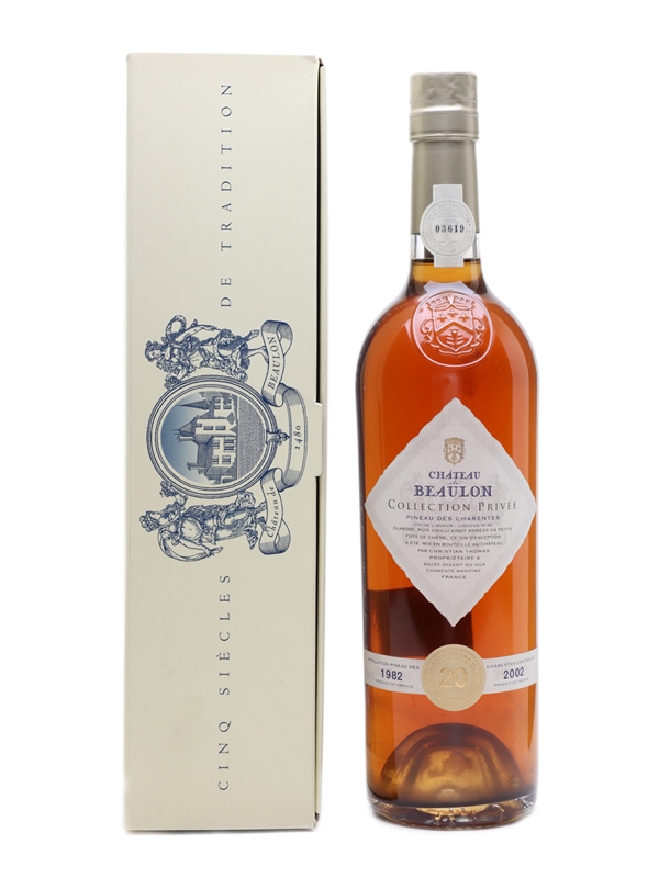 A bottle of Chateau de Beaulon 20 Year Old Pineau des Charentes, a fortified wine from the Cognac region. This was produced in 1982, matured in small oak casks and bottled in 2002.